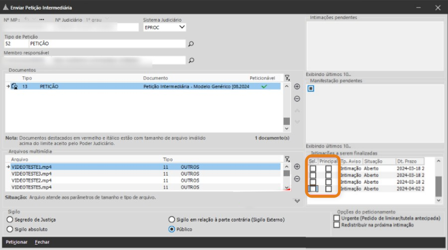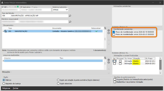 - A intimação selecionada como principal será encerrada no Judiciário com o documento peticionado e o tipo de petição selecionado pelo membro na tela de petição.