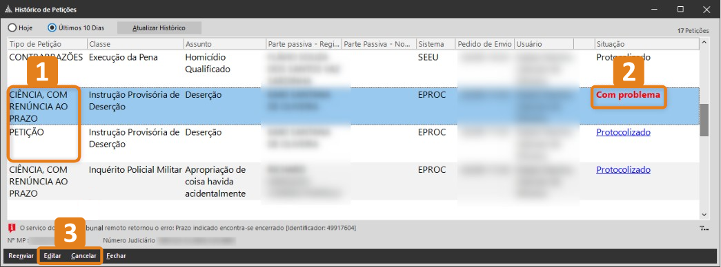Quando isso ocorrer, recomenda-se acessar o histórico de petições para realizar a edição ou o cancelamento manual da pendência inconsistente. Para isso, clique em "Editar" ou "Cancelar" (3).