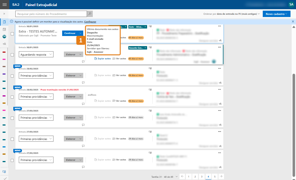 Passo 1. Acesse o Painel Extrajudicial e, na tarefa desejada, posicione o cursor do mouse sobre a opção "Espiar autos" (1).